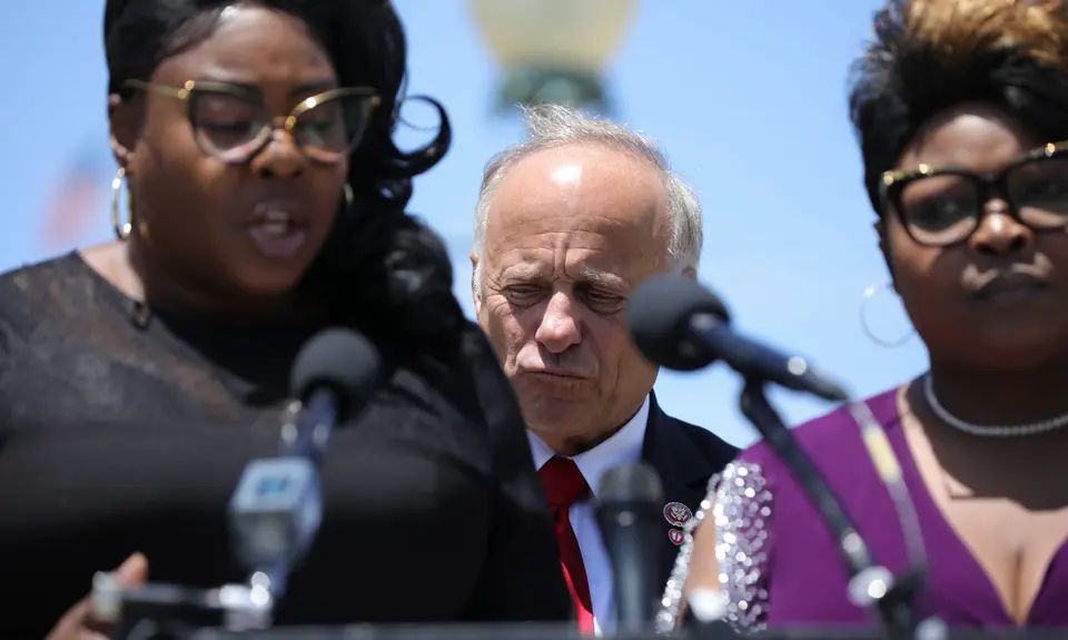 Rep. Steve King and pro-Trump social media personalities Diamond and Silk review notes before introducing "The Diamond and Silk Act" outside of Congress on June 13, 2019. (Photo: Jared Holt for Right Wing Watch)