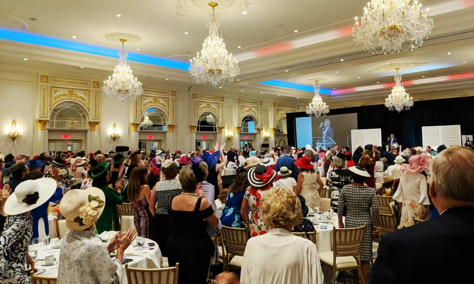 The Trump International Hotel's largest ballroom was packed wall-to-wall with Republican women donning ornate hats and fascinators made of mesh, lace, ribbon, and feathers, at the Virginia Women For Trump’s “Tea for Trump” event yesterday, which celebrated the belated birthday of President Donald Trump. Organizers repeatedly insisted that the idea that women do not like Trump was “fake news.”