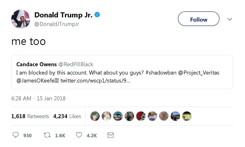 Responding to Owens, Trump Jr. reported that he had also been blocked by LeGate: