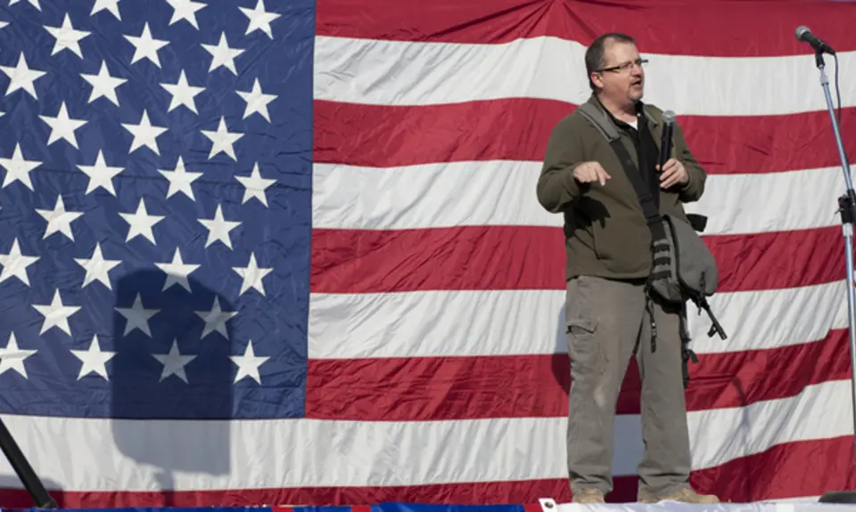 Stewart Rhodes, founder of Oath Keepers, speaks to the crowd during a pro-2nd amendment rally in Coeur d'Alene, Idaho, on January 19, 2013. Photo: Gregory Johnston via Shutterstock