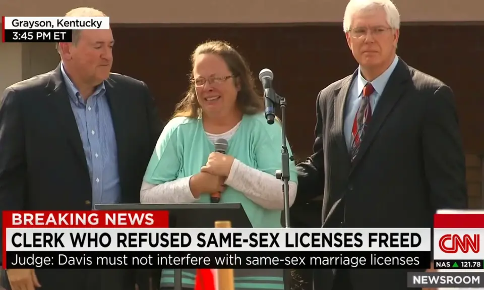 As protesters (who “didn’t think my rights mattered”) start to gather at her office, Davis meets with her next betrayal, this time from a lesbian couple whom she had known for years and considered to be “friends.” They ask her for a marriage license. “I’ve known you my whole life,” Davis recalls telling one of them. “Why do you want to come here and do this? You know I’m not issuing licenses.”