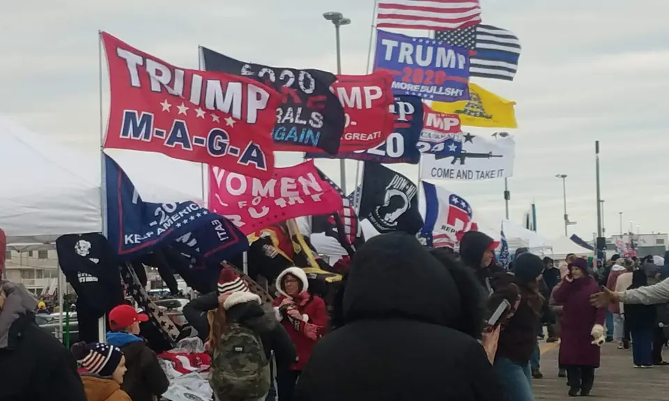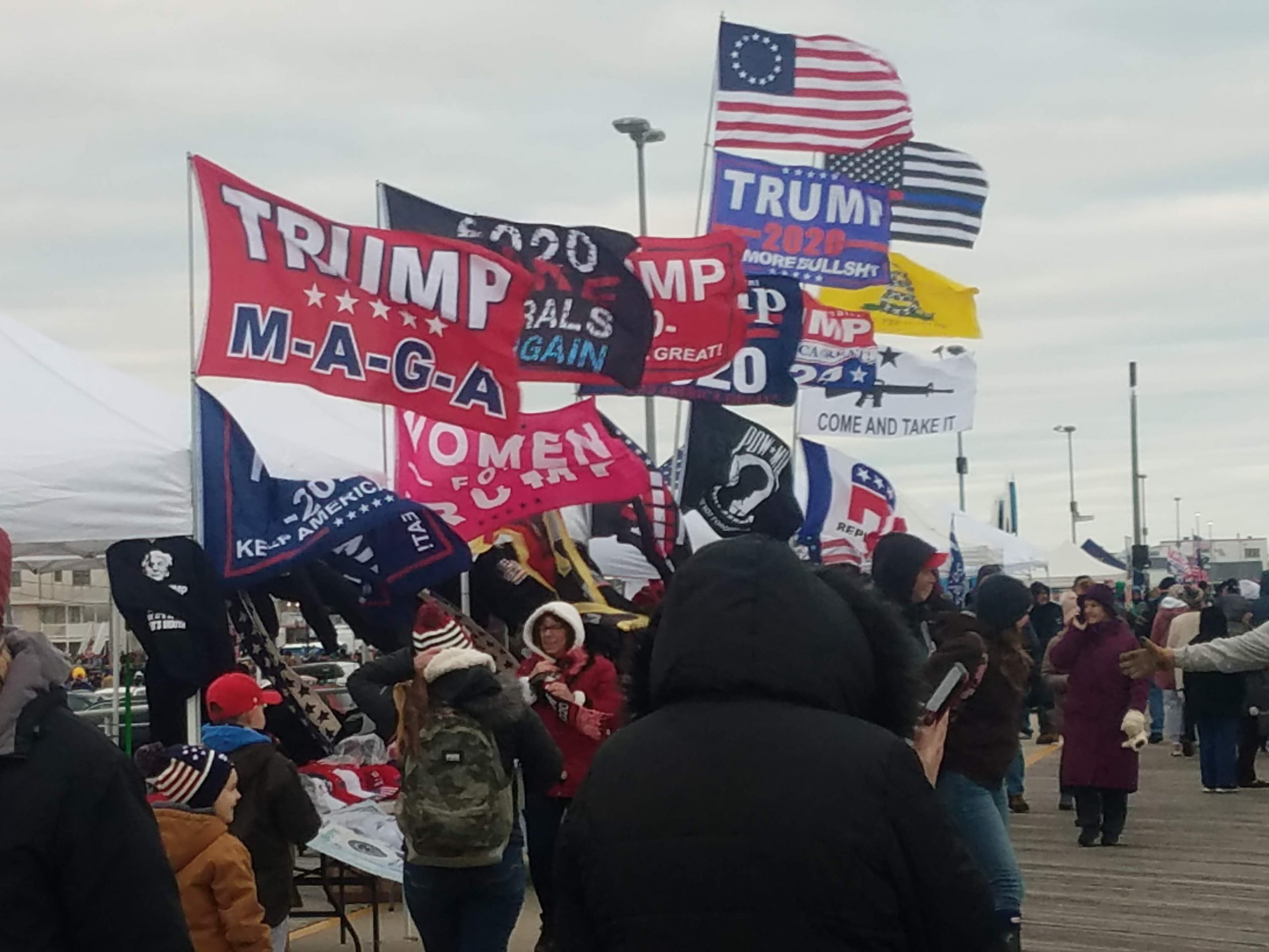 Flags emblazoned with Trump campaign themes dot the boardwalk in Wildwood, New Jersey, ahead of the president's appearance at a rally on January 28, 2020. (Photo: Adele M. Stan for Right Wing Watch)
