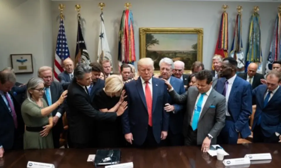The White House released photos showing the group gathered around a table in the Roosevelt Room and a shot of the group surrounding Trump and laying their hands on him in prayer.