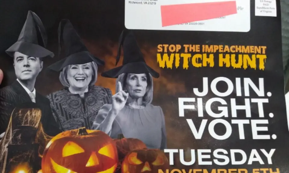 The Virginia elections took a spooky national turn on Halloween thanks to the Republican Party of Virginia. In mailers, first reported on by BlueVirginia’s lowkell, the state party accused national Democratic leaders of carrying out a witch hunt in their impeachment inquiry of President Donald Trump, evoking a religious right call to protect Trump from witchcraft.