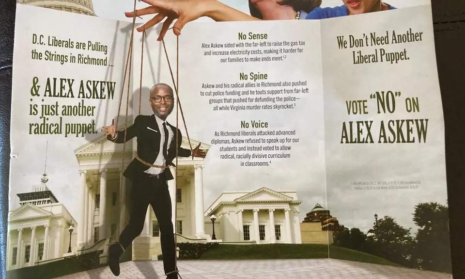 “D.C. Liberals are Pulling the Strings in Richmond… Alex Askey is just another radical puppet,” the text reads of one mailer. On the flip side, the mailer calls on recipients to “Vote early Karen Greenhalgh.”