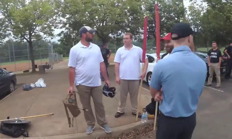 Photos and chat logs make clear that Blevins attended the Unite the Right 2017 convergence on Charlottesville, Virginia. He posted in a Unite the Right planning server that he would be flying an Oklahoma 46 flag at the gathering—a promise on which he followed through. Prior to the event, he asked other Unite the Right attendees whether a baseball bat wrapped in barb wire—a weapon he said he made to accompany his Halloween costume of The Walking Dead character “Negan” in 2016—would “be a bit excessive to bring” to the gathering.