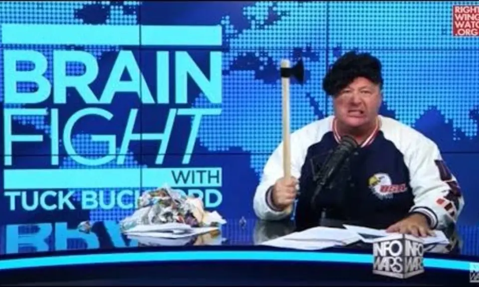 Jones responded last week by unveiling his own parody of the Buckford character, whom he confusingly presented as a left-wing commentator in the mainstream media who had had his name and image stolen by Jones. As "the real Tuck Buckford," Jones conducted an "interview" with President Trump that primarily consisted of Jones bashing a Trump pinata in the face with a hatchet, before tearing its head open with his bare hands while growling and screaming that "we run this country now like North Korea" as he wildly waved his hatchet around and smashed things.
