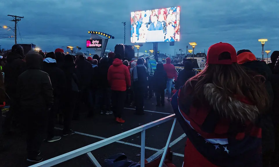 A young white man with cargo pants tucked into his boots walked up and down the line of people who had waited in the cold for hours hoping to get inside President Donald Trump’s rally in Wildwood, New Jersey, Tuesday evening, handing them flyers for a white nationalist organization. With the organization’s logo patched across the front of his khaki baseball cap, he took no strides to hide his affiliation.
