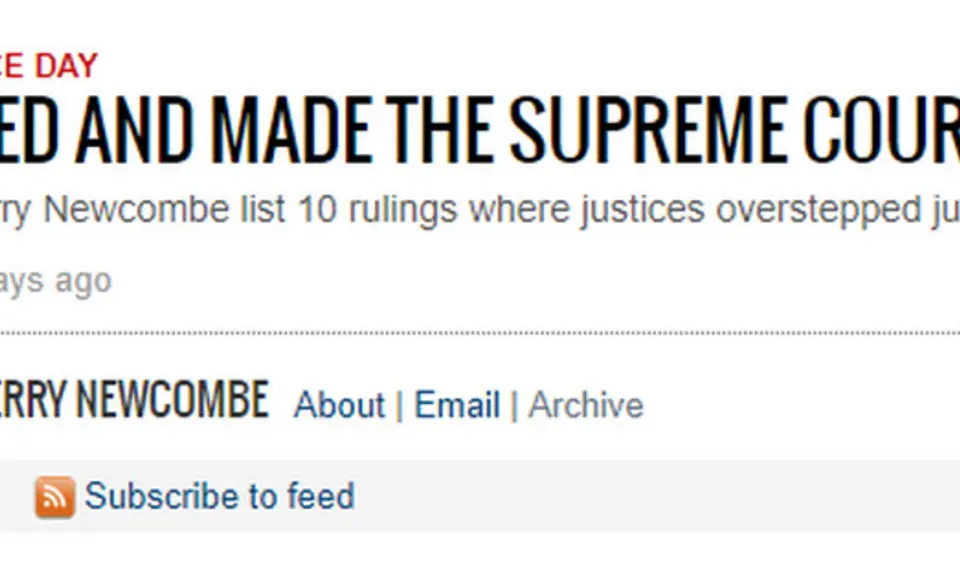 Among the rulings Newcombe cites as examples of the Supreme Court’s “tyrannical” actions are rulings against official prayer, the posting of the Ten Commandments and devotional Bible reading in public schools and “equal time for creation science” in classrooms.
