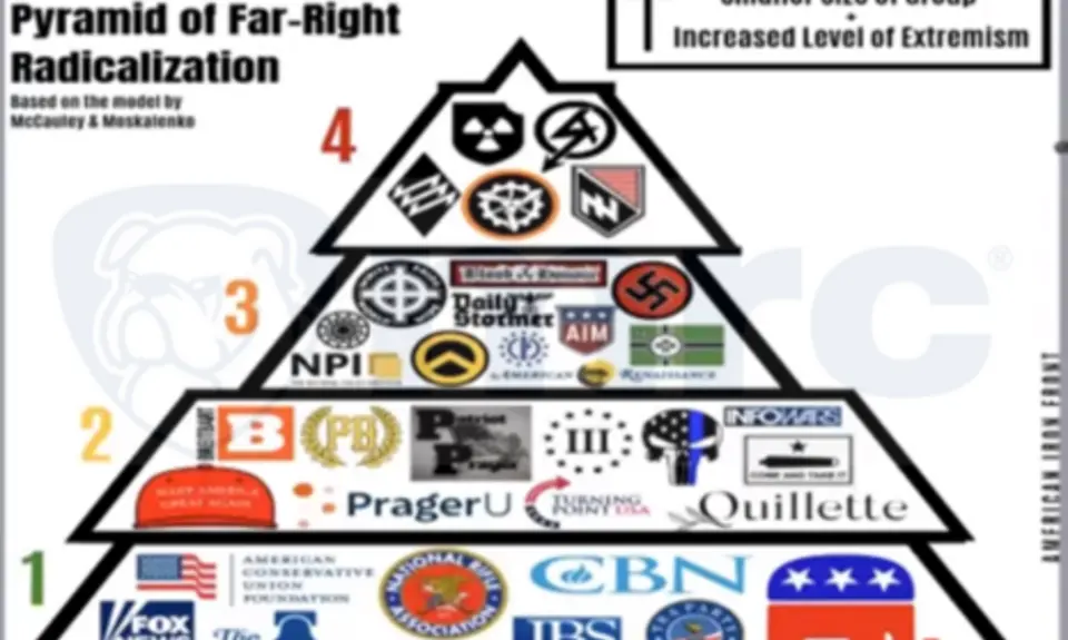 During the seminar, Loadenthal shared an outrageous “Pyramid of Far-Right Radicalization” that he claimed depicts the “modern far-right” and extremism in America.