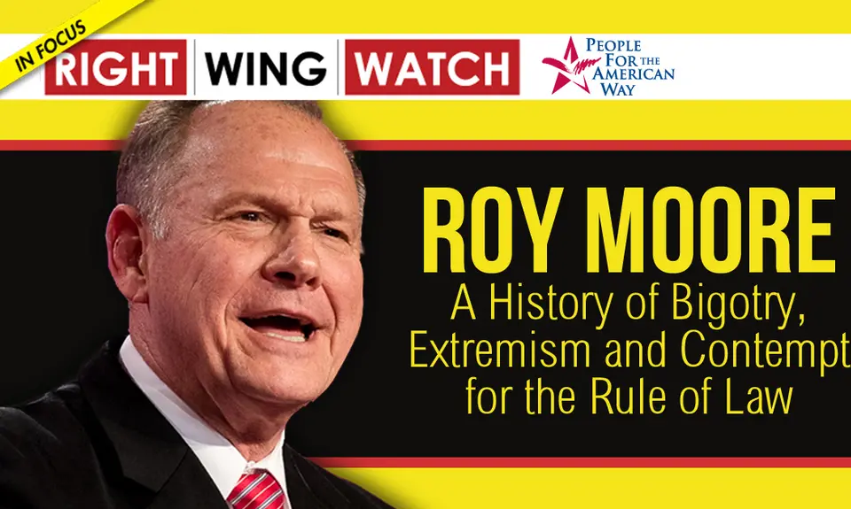 Moore has also made ample use of the Religious Right’s cynical strategy of equating criticism of political positions and tactics with an attack on religious freedom and Christianity itself. Moore has said the separation of church and state is “used to exclude Christians from holding public office” and that “Christians are being forced to give up their position in government or else succumb to something that they don’t believe.”